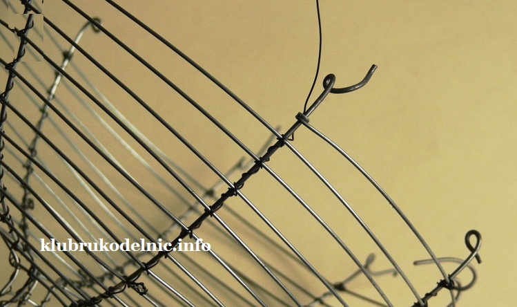 7. Этой проволокой сделаем не только дно, но и стенки корзинки, соединяя места перекрещения тонкой проволокой. Когда кусок проволоки кончится, привяжем второй. Закрученный конец украсим колечком.