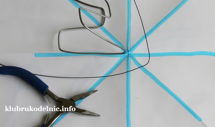 2. Теперь лист бумаги сложим пополам, и еще пополам и так восемь раз. Получим круг, разделенный на восемь частей. В соответствии с размерами этой выкройки сделаем четыре луча, которые в центре дна согнем в виде V. К каждому куску толстой проволоки подготовим еще один кусок тонкой проволоки, длина которого примерно на 30 см длиннее.