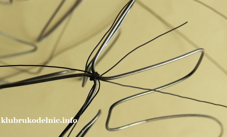 3. Итак у нас четыре ребра, согнутых пополам, и к каждому одну тонкую проволочку. Все согнутые проволоки свяжем новым куском тонкой проволоки. Сначала свяжем два ребра и с тонкой проволокой а потом добавим вторую половину.