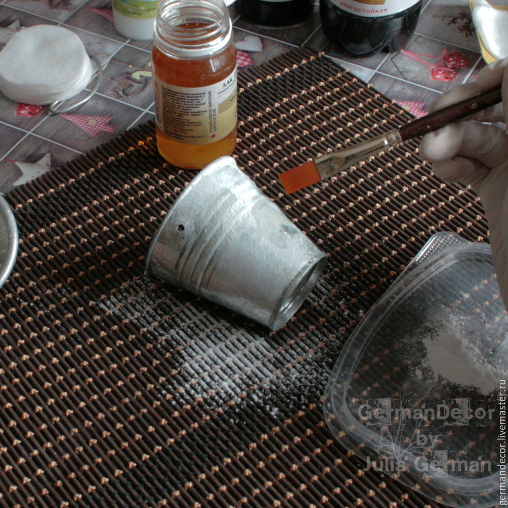 1. Для работы нам понадобится сам предмет декорирования (это может быть любая металлическая поверхность или какая-либо другая, но предварительно загрунтованная и покрытая краской цвета металлик), шеллачный лак (я использую готовый шеллак фирмы Таир), художественный тальк либо детская присыпка, морилки цвета «Дуб» и «Мокко», ацетон ( я использую строительный), кисти для нанесения шеллака и морилок (у меня плоские синтетические, но подойдут и другие), ватные диски, наждачная бумага, маленькое сито.