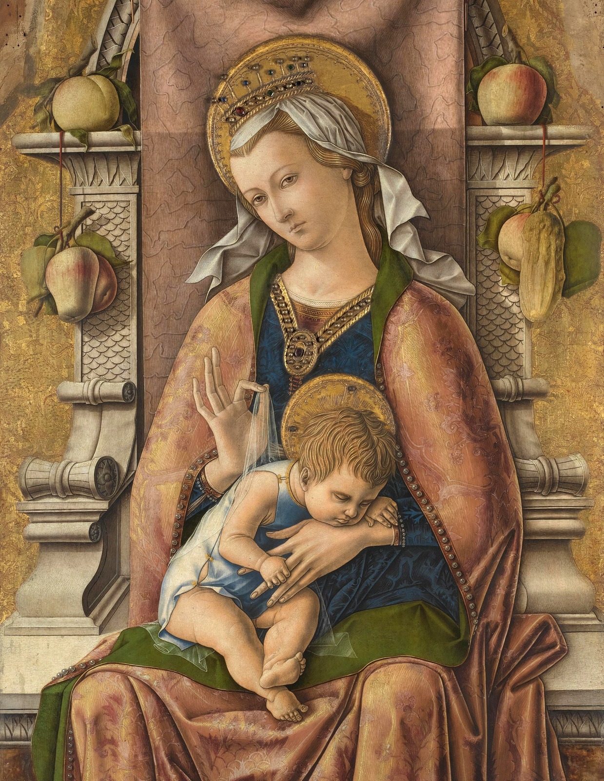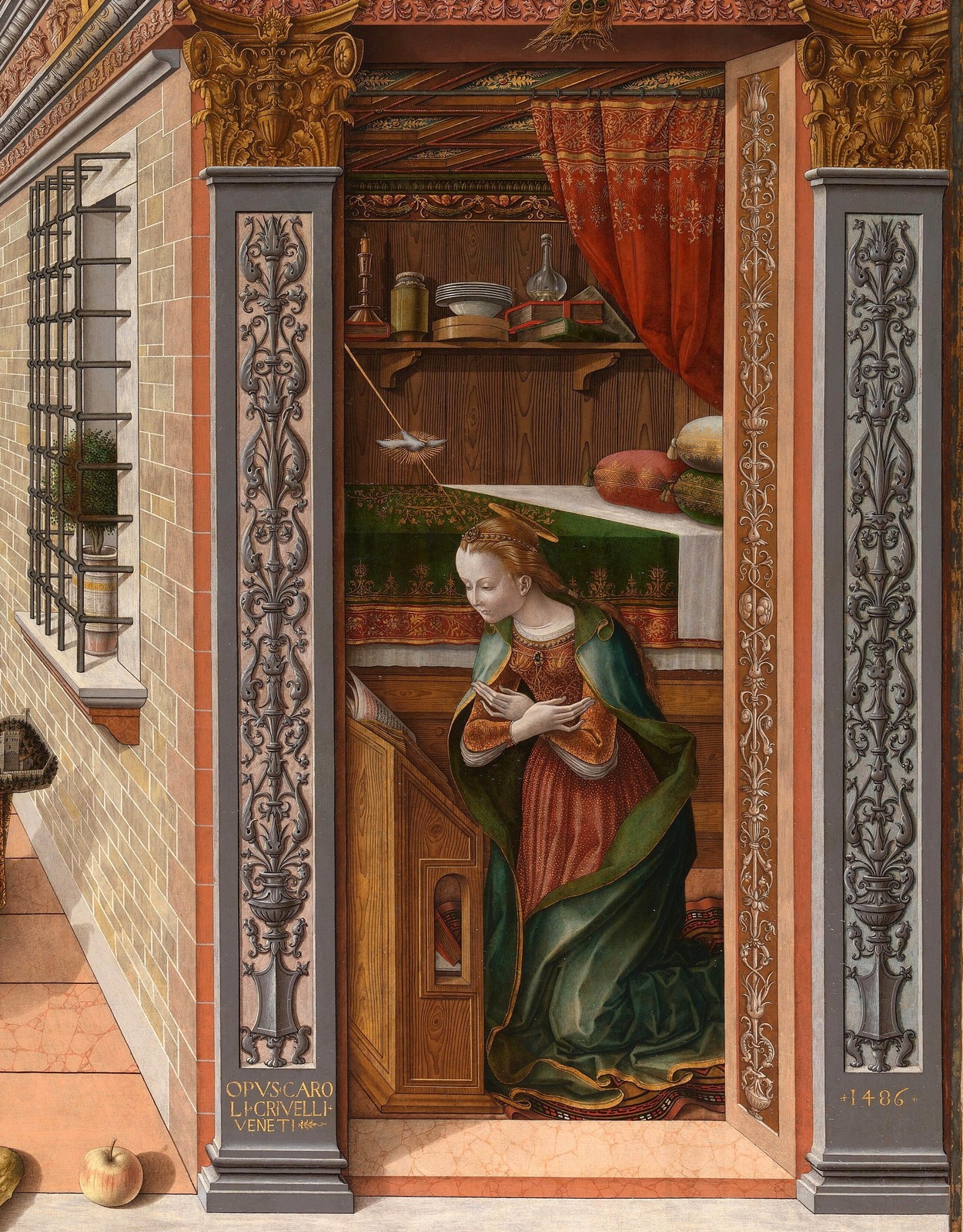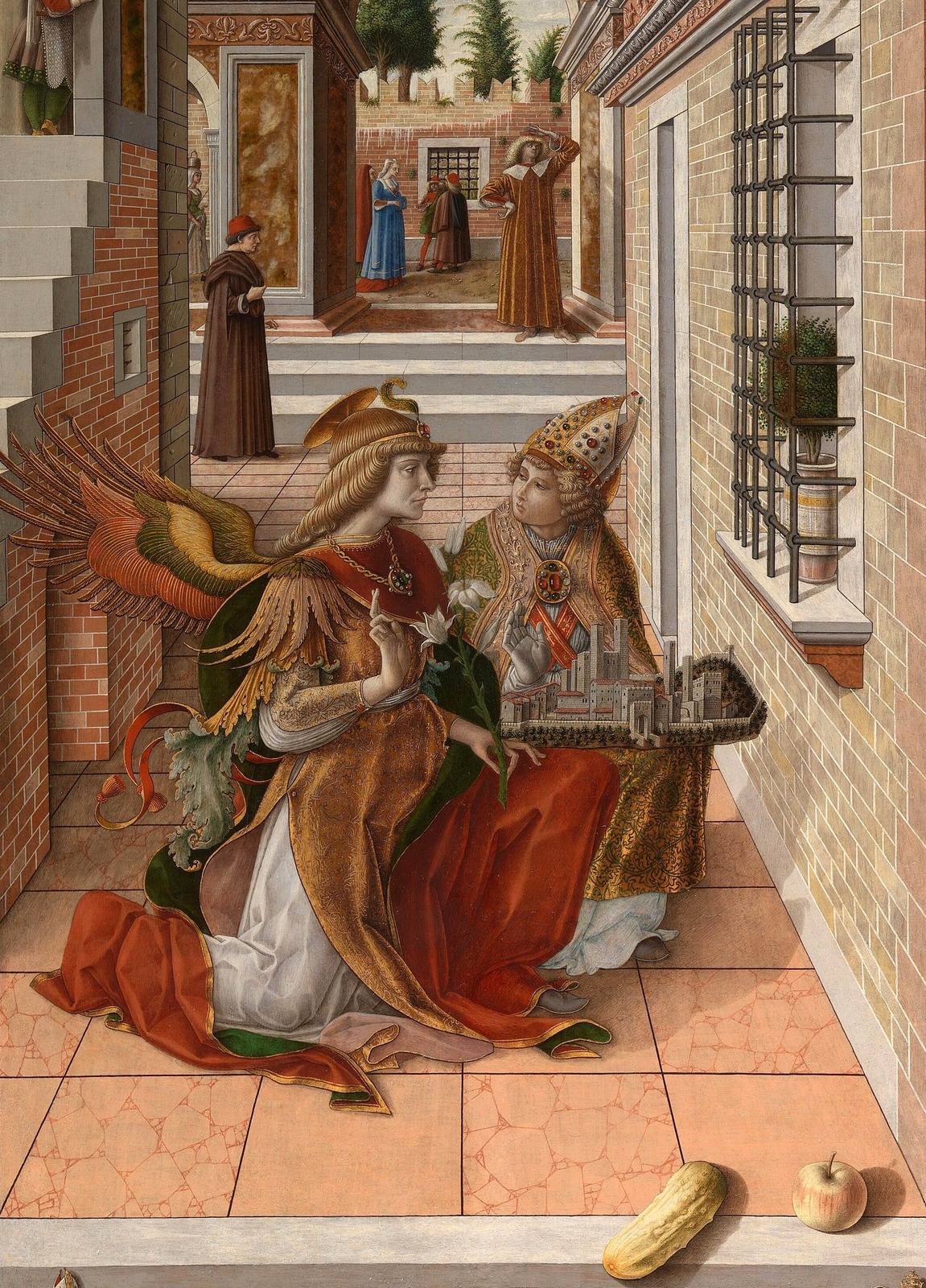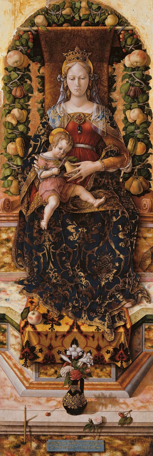 Карло Кривелли стремился передать целый мир, увиденный глазами художника XV века. На переднем плане помещены яблоко, символизирующее первородный грех, и огурец - плодородие и сады Эдема. Оба плода – своего рода «обманки»: огурец съезжает» с цоколя, переходя из живописного пространства в реальное.