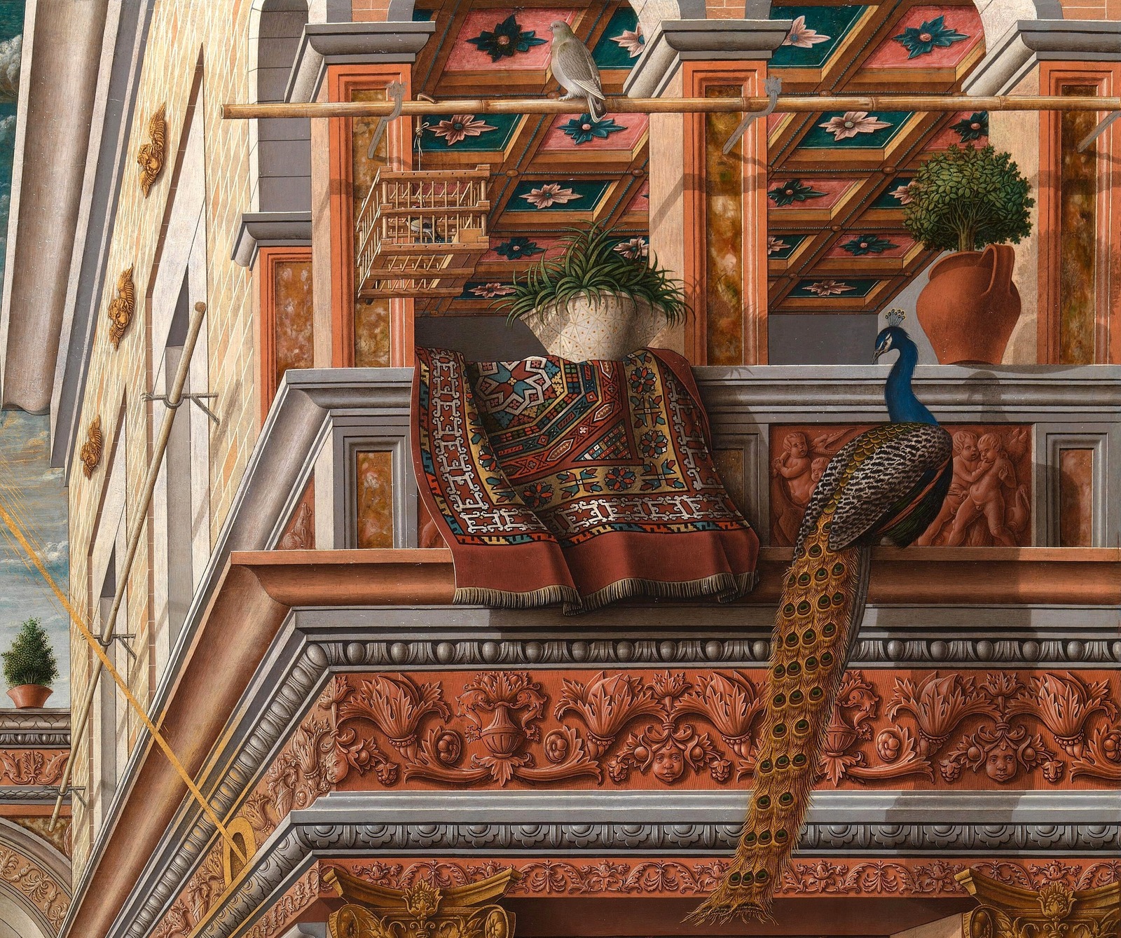 Над жилищем Мадонны возвышается второй этаж с просторной лоджией, создавая общее впечатление аристократического дворца. Павлин, восседающий на карнизе второго этажа, – намек на бессмертие, вечную жизнь, уготованную праведникам.
