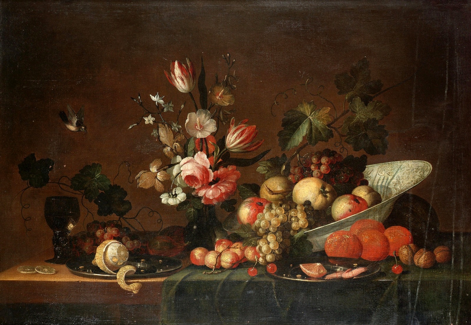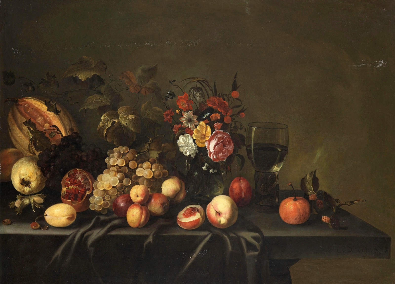 1650_Фруктовый натюрморт с вазой цветов и рёмером (Fruit still life with flower vase and Romer)_65 х 89_х.,м._Частное собрание