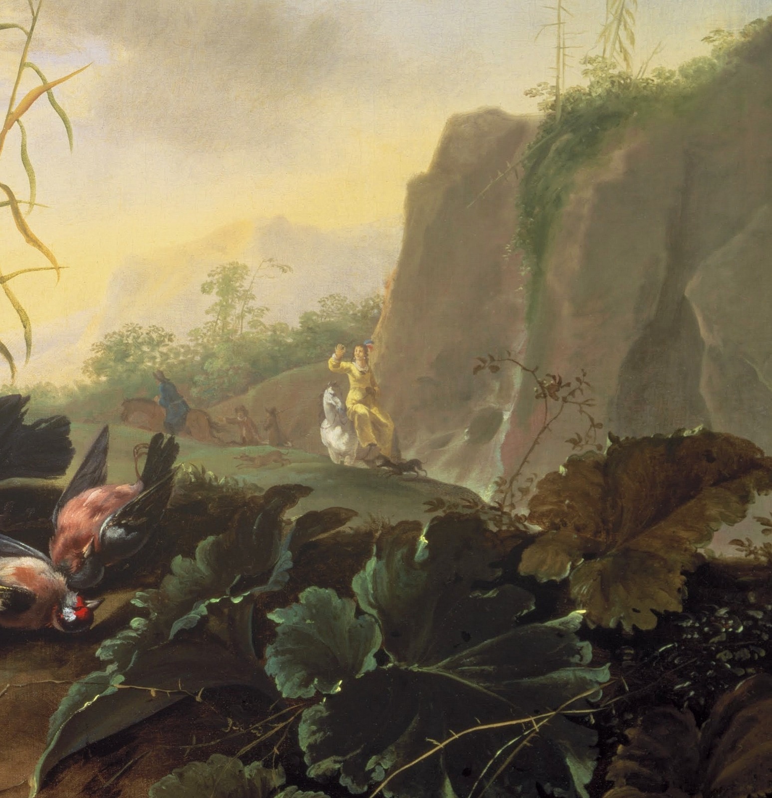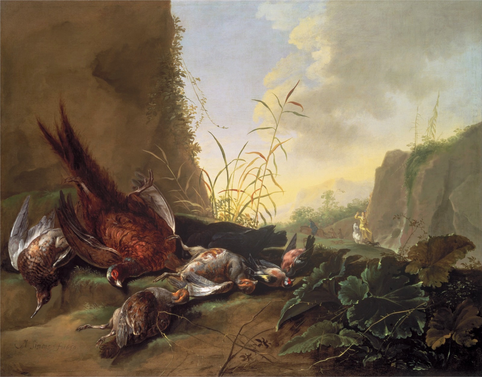 У подножия обрывистого склона в гористом пейзаже лежит груда мертвых птиц: вальдшнеп слева, рядом с ним фазан и какая-то крупная черная птица, возможно, глухарь; перед ними две куропатки, зяблик и щегол. В семнадцатом веке все эти виды птиц считались съедобными и на них регулярно охотились.