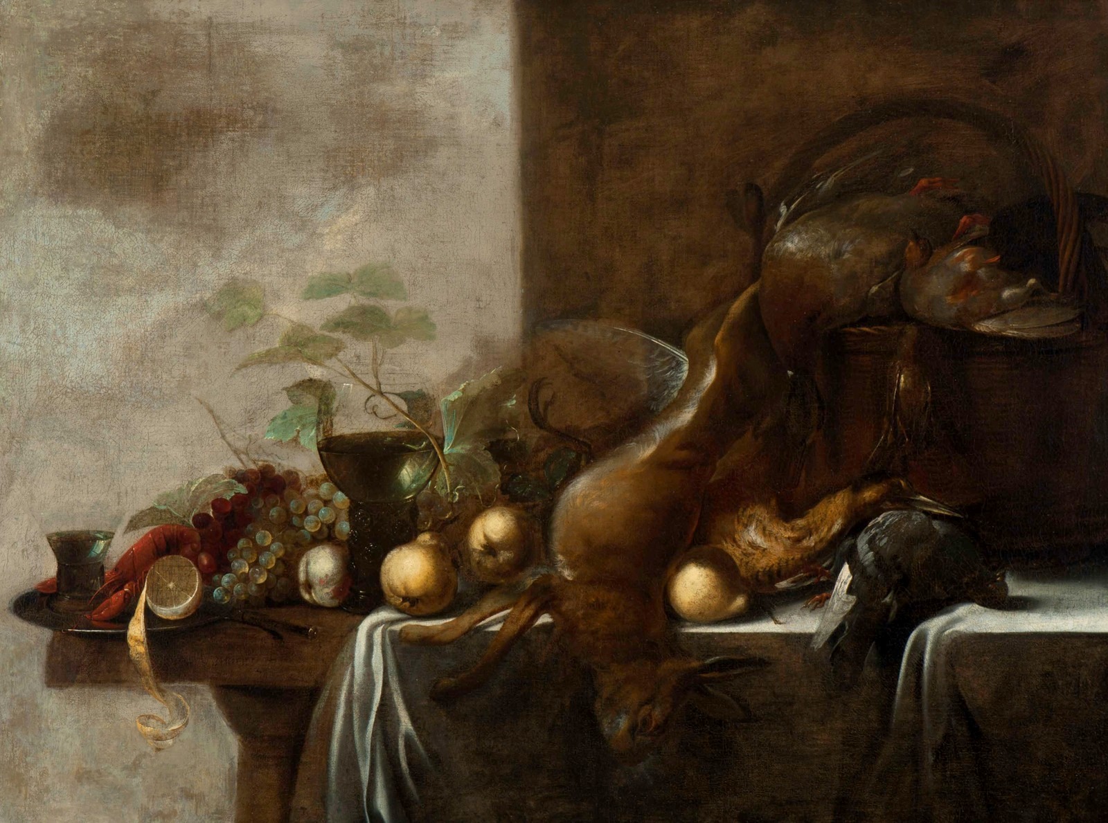 Натюрморт с зайцем, битой дичью, омаром, фруктами и бокалом (Still life with hare, game, lobster, fruit and wine glasses)_97.5 х 131.5_х.,м._Частное собрание