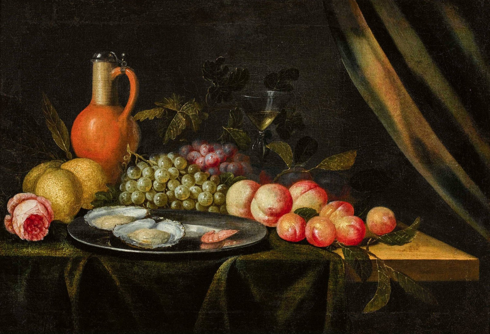 Натюрморт с фруктами, кувшином, розой и устрицами (Still life with fruits, pitcher, rose and oysters)_53.5 х 78_х.,м._Частное собрание