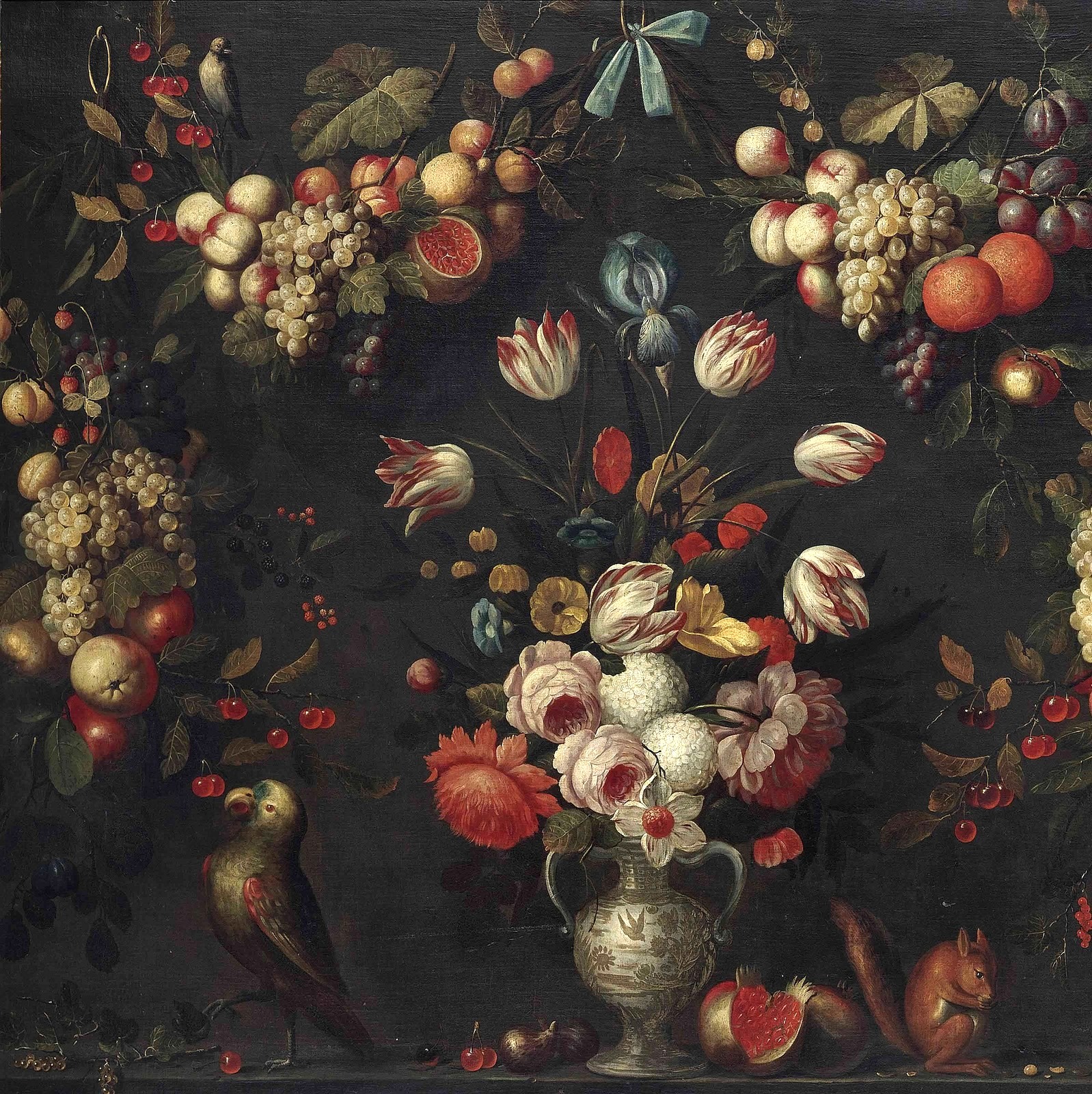 Натюрморт с цветами, белкой и птицами (Still life with flowers, squirrel and birds)_52.4 х 121_х.,м._Частное собрание