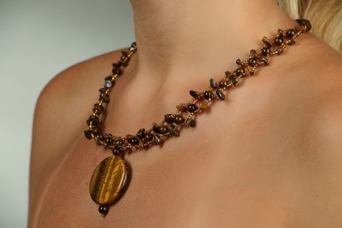 В ожерельях бусины могут быть и круглыми, и пластинчатые. При этом мастер не всегда придает правильную форму, красиво смотрятся ожерелья и с неправильными очертаниями. Великолепно смотрятся браслеты из тигрового глаза.