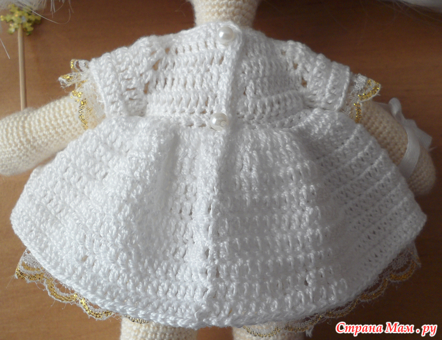 Обвязать спинку и горловину сбн, замкнуть деталь. Далее вяжем по кругу.