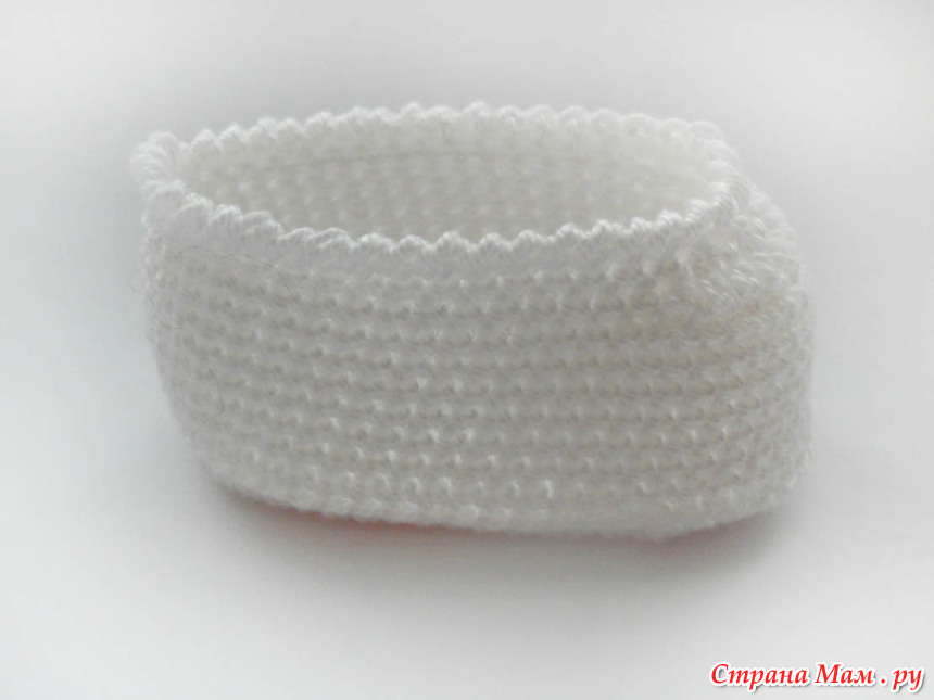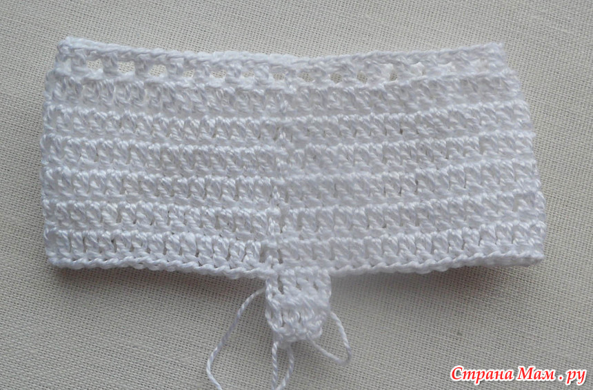 1 ряд – со второй от крючка петли: 10 сбн, 3 сбн в крайнюю петлю, по второй стороне цепочки: 9 сбн, пр (24)