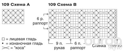 (27) 30 (33) п. вязать лицевыми (= лицевая гладь), затем на 9 п. по схеме В (= отмеченный для рукава фрагмент), на 25 (27) 30 (33) п. лицевыми.