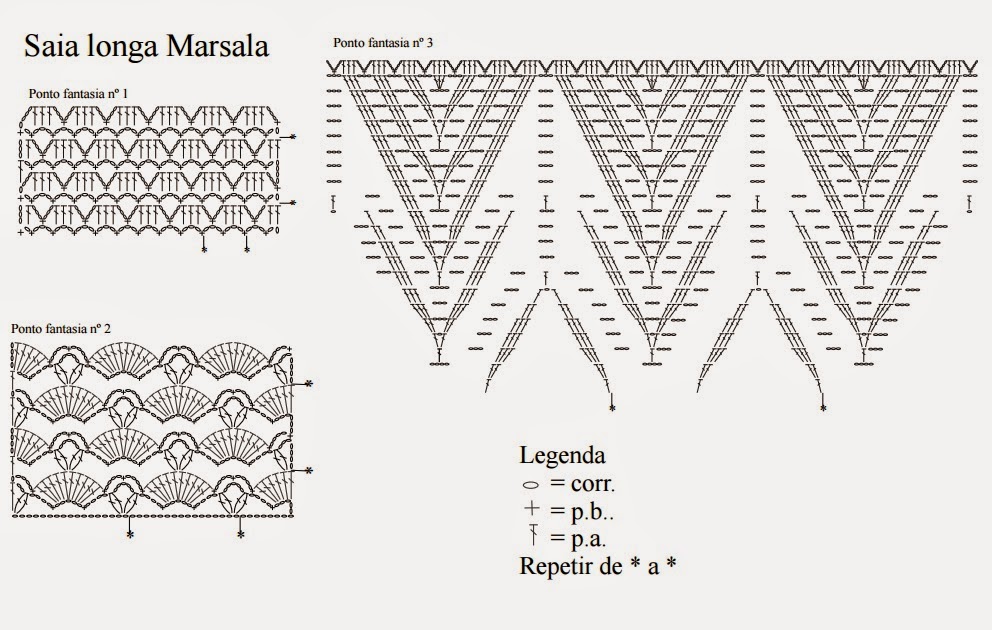 Correntinha (corr.). Ponto baixo (p.b.): introduza a ag., laç., puxe o p. e com outra laç., rem. todos os p.. Ponto alto (p.a.): laç., introduza a ag., laç., puxe o p. laç., rem., 2 p. e com outra laç., rem. todos os p Ponto fantasia 1, 2, 3 e 4: siga o gráfico correspondente. Ponto de arcos: siga o gráfico. Motivo: siga o gráfico.