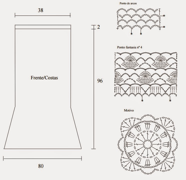 Frente e costas – São trabalhadas juntas. Comece pelos motivos. Faça uma corr. de 8 p. feche em círculo e trabalhe o motivo seguindo o gráfico. Terminado o gráfico rem.. Faça 8 motivos iguais unindo-os entre si e em círculo durante a última carr.. Corte o elástico em 4 partes iguais e una as duas pontas bem firme para não soltar. Terminado todos os motivos para a parte de cima da saia trabalhe em círculo na seguinte ordem de pontos: 10 carr. em p. fantasia nº 1 seguindo o gráfico, repita de * a * no sentido do p. (30 v.), 9 carr. em p. fantasia nº 4 seguindo o gráfico, repita de * a * no sentido das carr. (13 v.), 4 carr. em p. a., 5 carr. em p. b. e rem. Deixe o elástico entre os p. das 4 primeiras carr. em p. b.. Para a parte inferior da saia trabalhe em círculo na seguinte ordem de pontos: 10 carr. em p. fantasia nº 1 seguindo o gráfico, repita de * a * no sentido dos p. (30 v.), 6 carr. em p. fantasia nº 2 seguindo o gráfico, repita de * a * no sentido dos p. (10 v.), 3 carr. em p. de arcos seguindo o gráfico, repita de * a * no sentido dos p. (42 v.) em seguida trabalhe em p. fantasia nº 3 seguindo o gráfico. Terminado o gráfico rem..