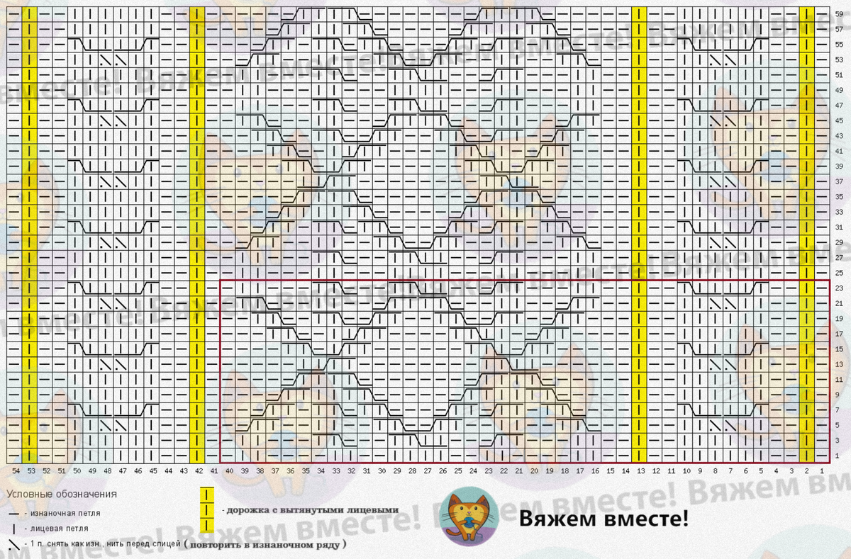❗На схеме даны только лицевые ряды, а чётные ряды вяжутся так, как петли лежат на спице, за исключением двух петель вертикальной дорожки (5-10 петли) в 6, 12 и 22 рядах.