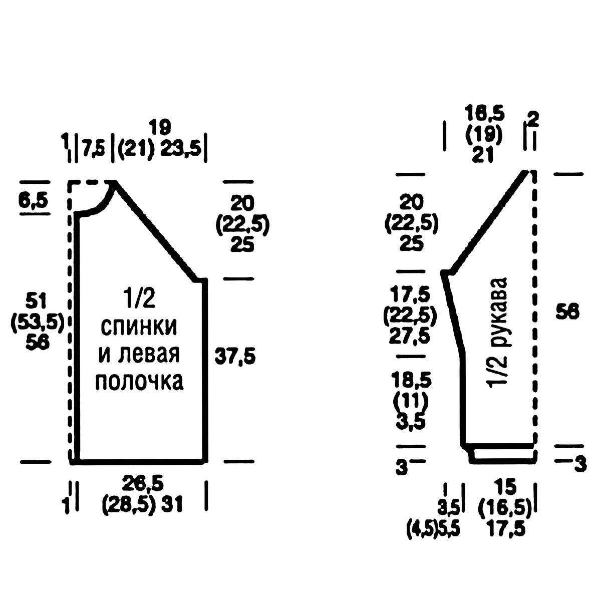 Через 37,5 см = 120 р. от начального ряда закрыть с обеих сторон для регланных скосов 1 х 4 п., затем подчеркнуто убавить в каждом 4-м р. 11 (13) 15 х 2 п. и далее в каждом 6-м р. 3 х 2 п.