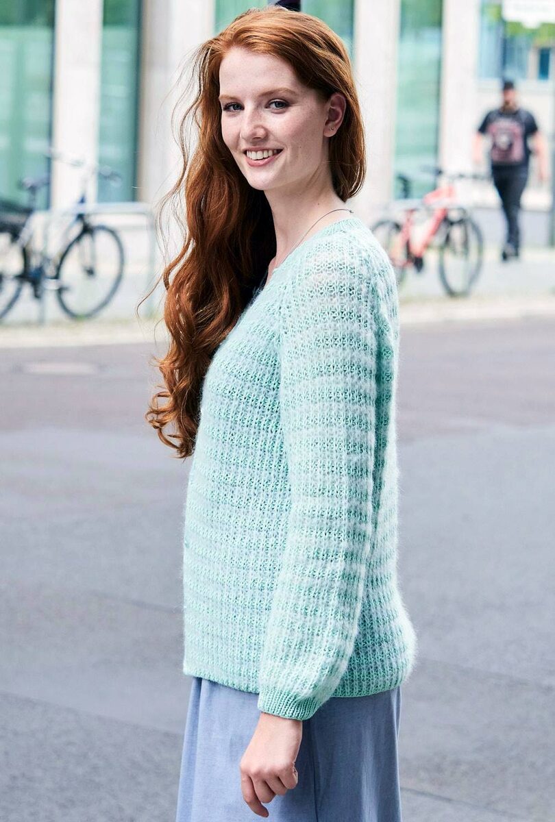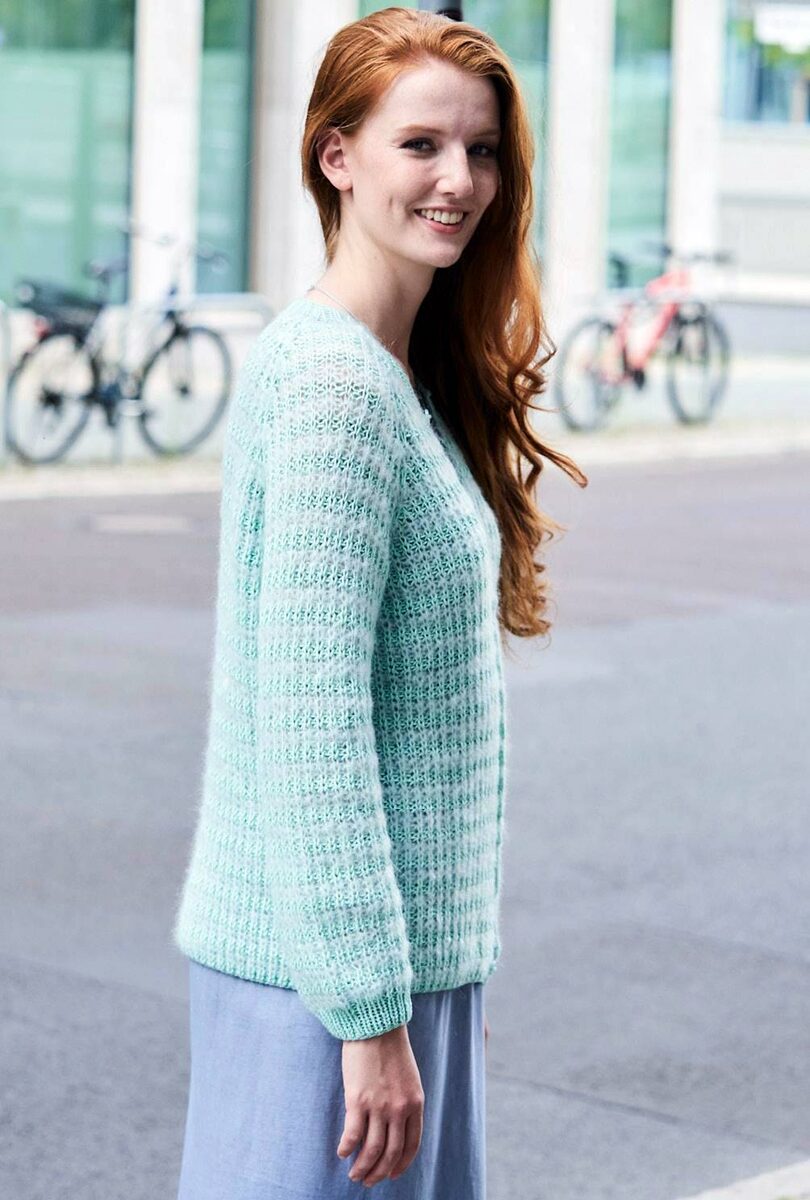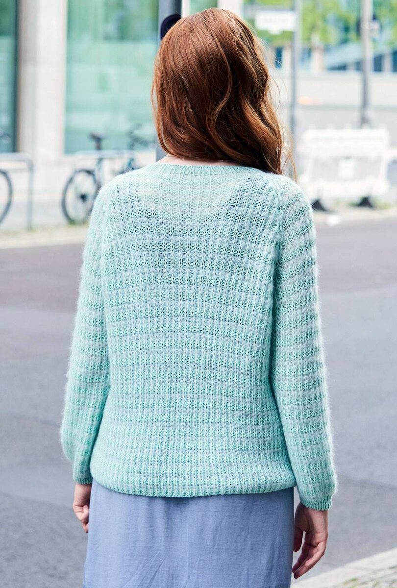 Для бейки нитью Madeleine набрать на круговые спицы по краю горловины правой полочки 15 п., по 7 отложенных петель рукавов и между ними 29 отложенных петель спинки провязать лицевыми, при этом убавить в общей сложности 6 кромочных 3 деталей (= провязать со следующей или предыдущей петлей вместе лицевой) и по краю горловины левой полочки набрать на спицы 15 п.