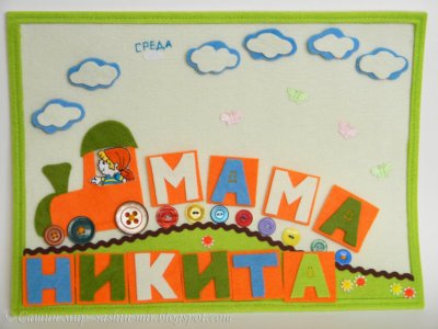 Размер панно 30х40 см. Подвешивается на петли. Использовала фетр, липучку, ленты(жел.дорога, бабочки), пуговицы пришивала пряжей, вышивала дни недели тоже пряжей, цветочки - бусины.