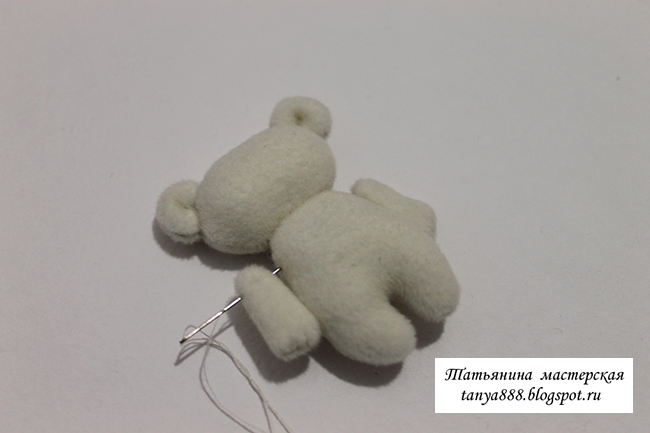 10. Пришиваем лапы к туловищу. Стараемся, чтоб расположение лапок тоже было симметричным. Для этого нам понадобится иголка длиннее. Вводим иголку в месте, где должна располагаться лапка (в верхней части бокового шва), протыкая туловище насквозь, протыкаем вторую лапку (в верхней части в шов). Проделываем тот же путь обратно раз пять, нитки очень сильно не затягиваем. Нитку закрепляем, вводим иголку внутрь туловища и обрезаем нитку на нет.