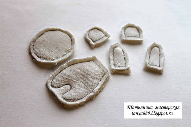 2. Вырезаем детали на ткани и скалываем булавками или сметываем ниткой. Для точности расстояние на туловище между лап можно надрезать после стачивания деталей.