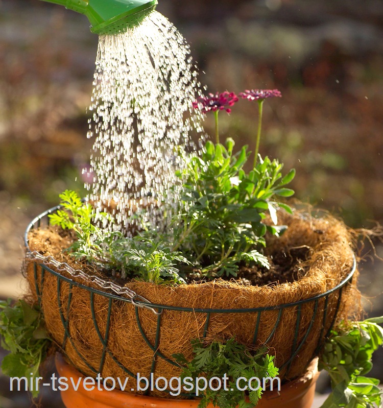 Обязательно! Сделанные цветочные корзины необходимо хорошо полить, подождать, вдруг почва чуть осядет, тогда ее нужно будет подсыпать и снова полить. Только после этого подвесные корзины для цветов с композициями можно подвесить.