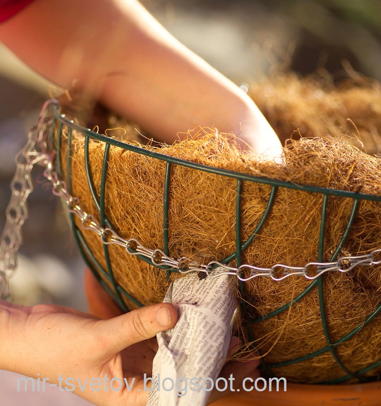 Вкладышем в корзину может служить мох, мешковина или кокосовый специальный вкладыш (в котором потом делаю отверстия для проталкивания корней внутрь). На вкладыш (например: мох) выстилают небольшой кусок пленки, чтоб вода сразу не выходила, а сверху кладут первый слой почвы. Высаживают растения (кладут горизонтально, чтоб цветки выглядывали из сетки, а корни просто ложились на землю), это могут быть однолетки, ампельные растения – герань, петунья, калибрахоа и т.п. Сверху корней опять кладут мох, землю и снова высаживают выбранные растения, затем опять идет слой мха, земли и высаживают пряморастущие цветы (последний ряд цветов) – гелиотроп, сальвия, фуксия, лобелия и т.п. Землей заполняют пустоты.