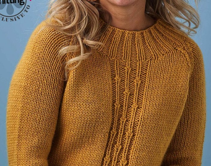 Модель связана с рукавом реглан снизу вверх раздельными деталями. Основной узор — лицевая гладь, поделенная на 4 части вертикальными панелями из резинки с вкраплениями в виде маленьких бутонов.