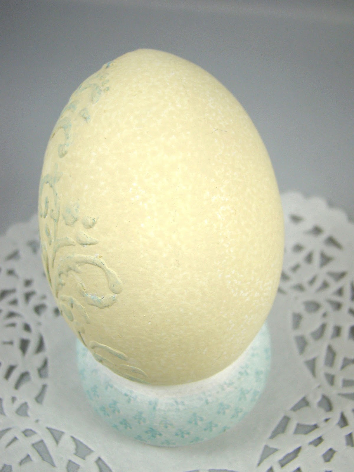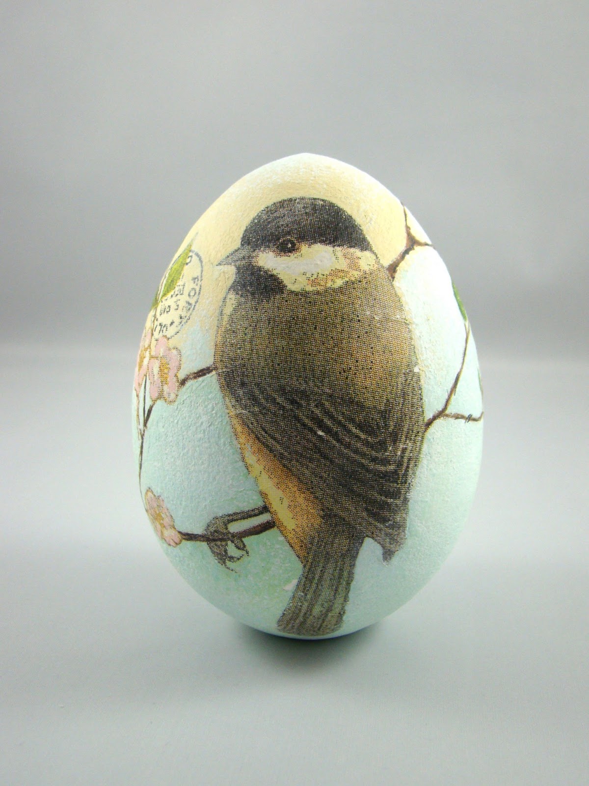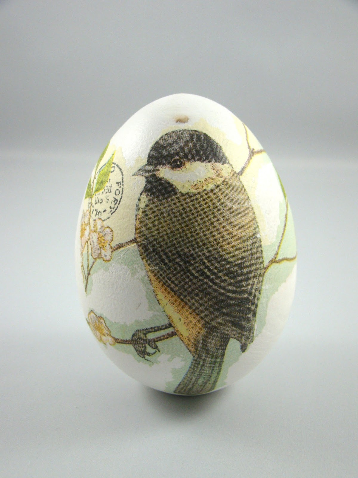 6. Для создания покрытия "яичная скорлупа". Я воспользовалась акриловой краской "античный белый" + Antiqe effect от Martha Stewart. Смешала их в пропорции 1/1. Нанесла губкой поролоновой на яйцо. Так сравняла фон.Картинку покроем 2-мя слоями лака. Только картинку.