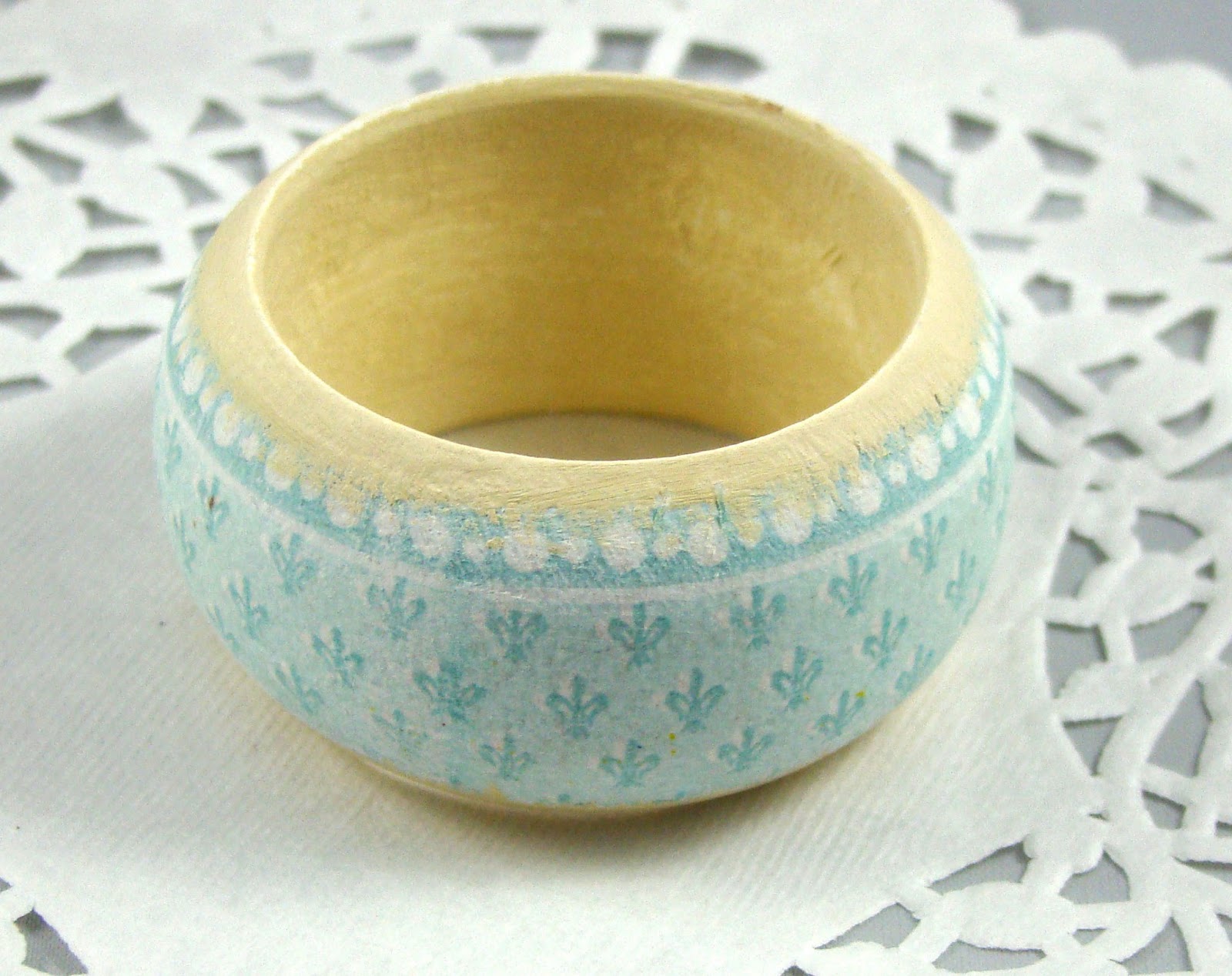 2. Оно будет на подставке. В качестве подставки я использую кольцо для салфеток. Тоже деревянное. Вырвала из салфетки фрагмент с букетом ландышей и вот такую полоску.
