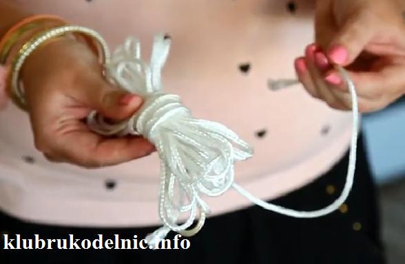 5. Отрежем кусок веревки, который немного длиннее высоты окна и проденем ее в сделданные дырочки.