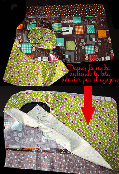 Мы поддерживаем весь мешок потянув ее через отверстие, которое Вы оставили без шитья,