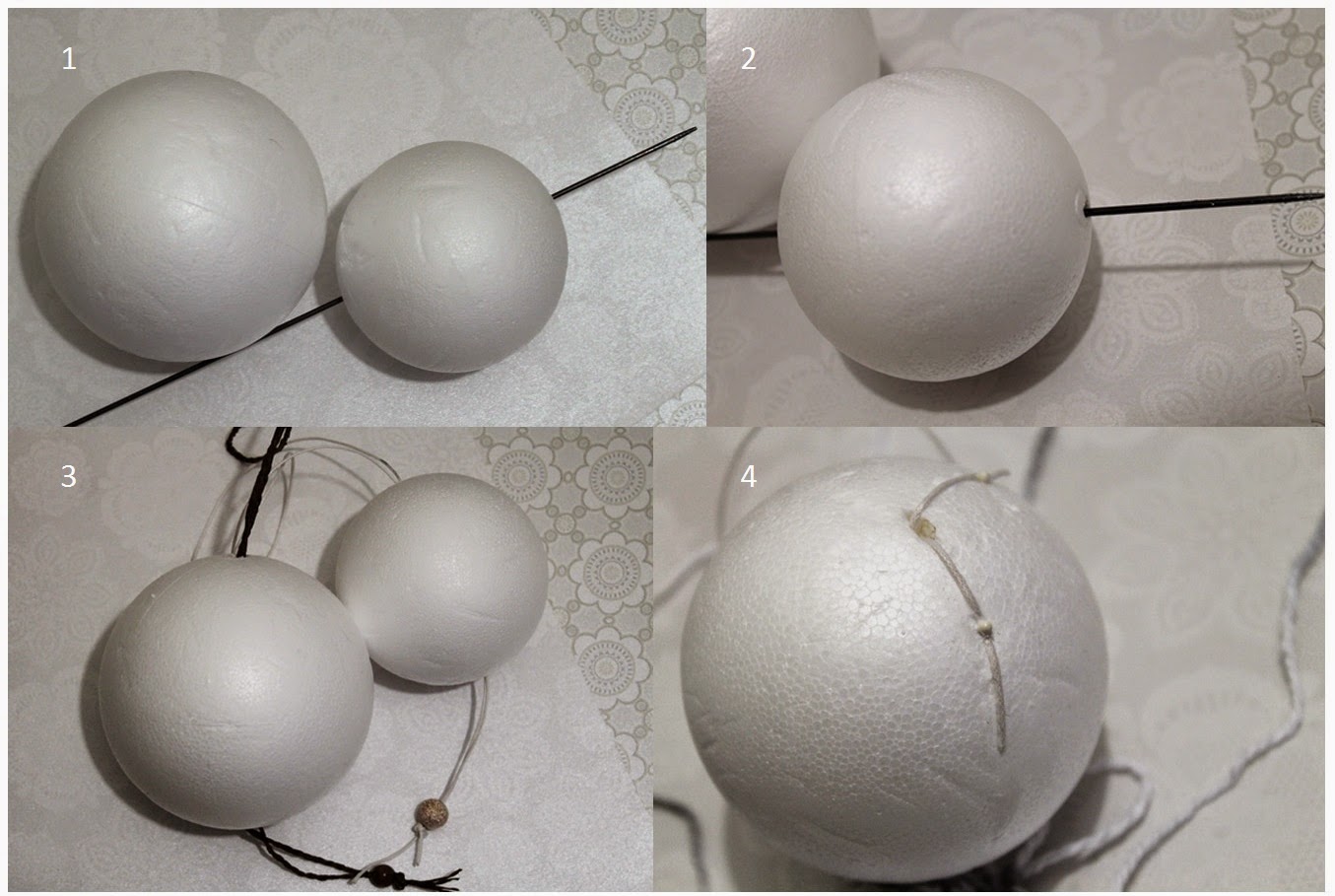 1. Сначала надо сделать петлю для подвешивания на елку. Прокалываем шар спицей, можно ее немного нагреть (только с пенопластовым шаром надо быть аккуратнее, горячая спица легко плавит пенопласт, и можно уйти в сторону...).