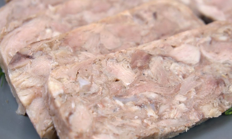 Желатин растворяем в 100 миллилитрах бульона, к нему через пресс пропускаем чеснок. Вливаем смесь к мясу, мясо выкладываем в форму, а сверху ставим наполненную водой банку.