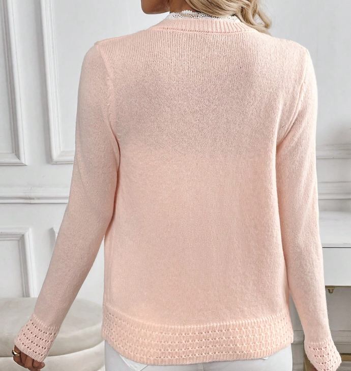 Очень красивая, женственная модель. Модель со свободой 10-15 см. Рукав втачной. По краю планки и ворота пришито белое кружево ручной или машинной вязки.