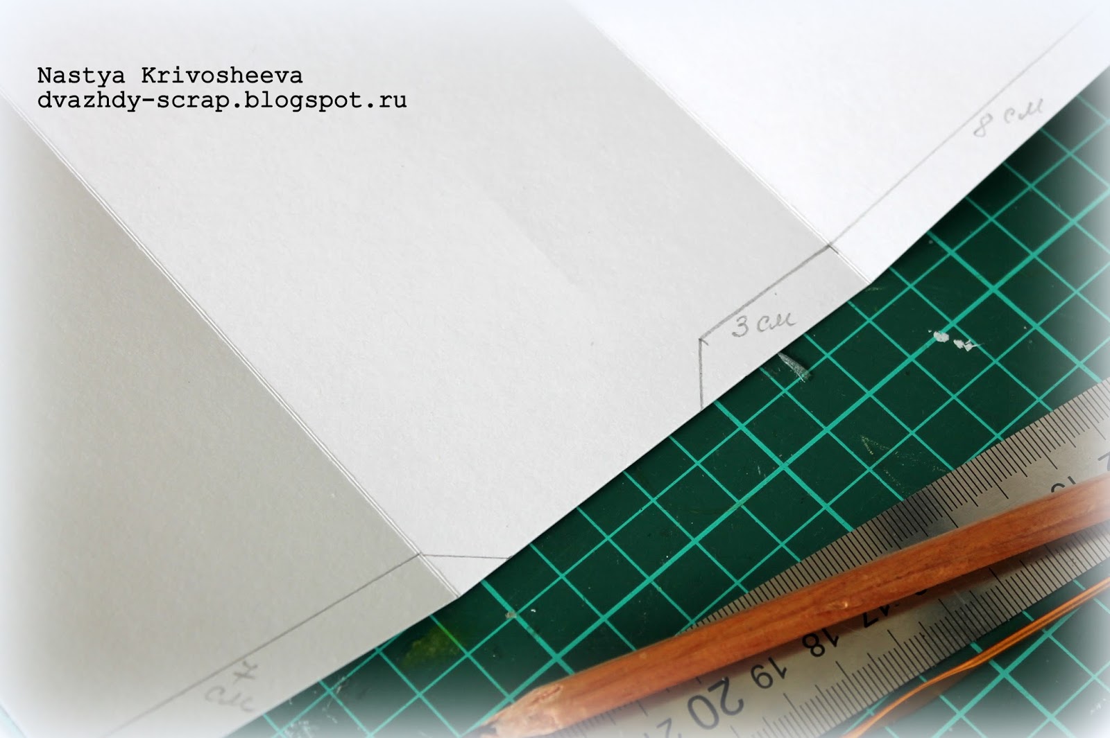 Далее с каждого бокового края отмечам по 1 см. Это нам необходимо, чтобы наметить "ушки", которые будут скреплять сам конверт и красиво формироваить карман. Намечаем "ушки" как показано на фото: от верхнего сгиба продлеваем на 3см., от нижнего намечаем сразу. Отререзаем намеченный 1 см. бумаги под углом 45 градусов.