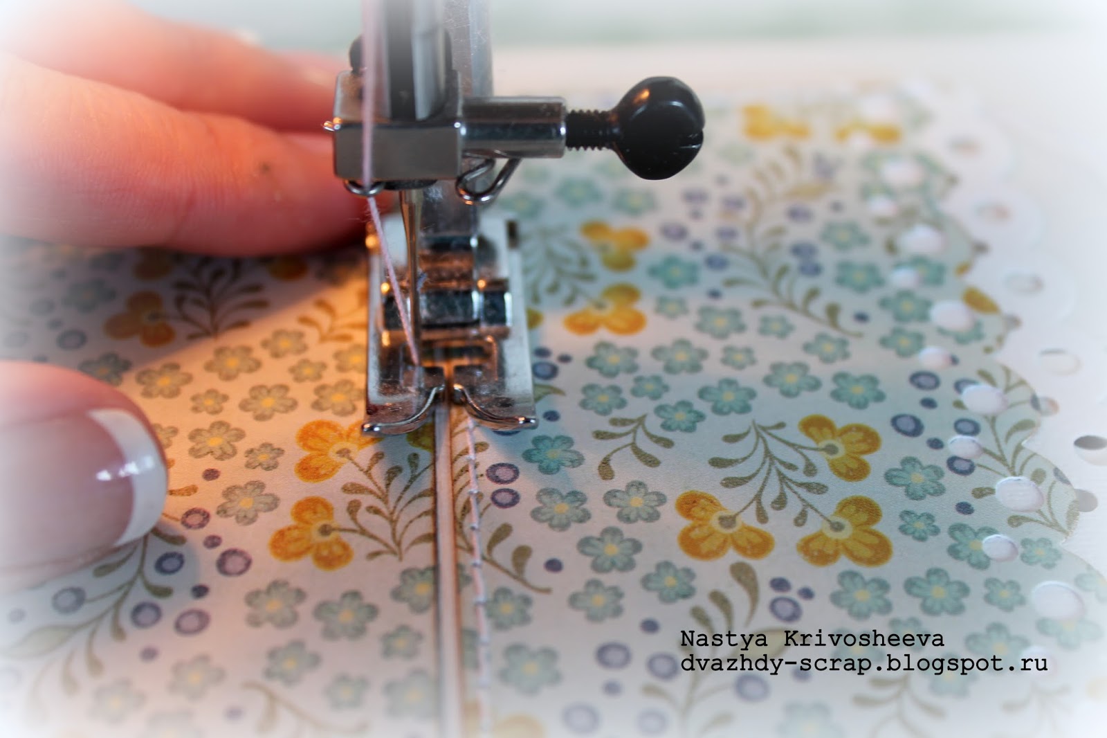 Затем приклеиваем скрапбумагу. Я наношу клей на середину бумаги и аккуратно по "бардюрному" краю. А по периметру делаю машинную строчку.
