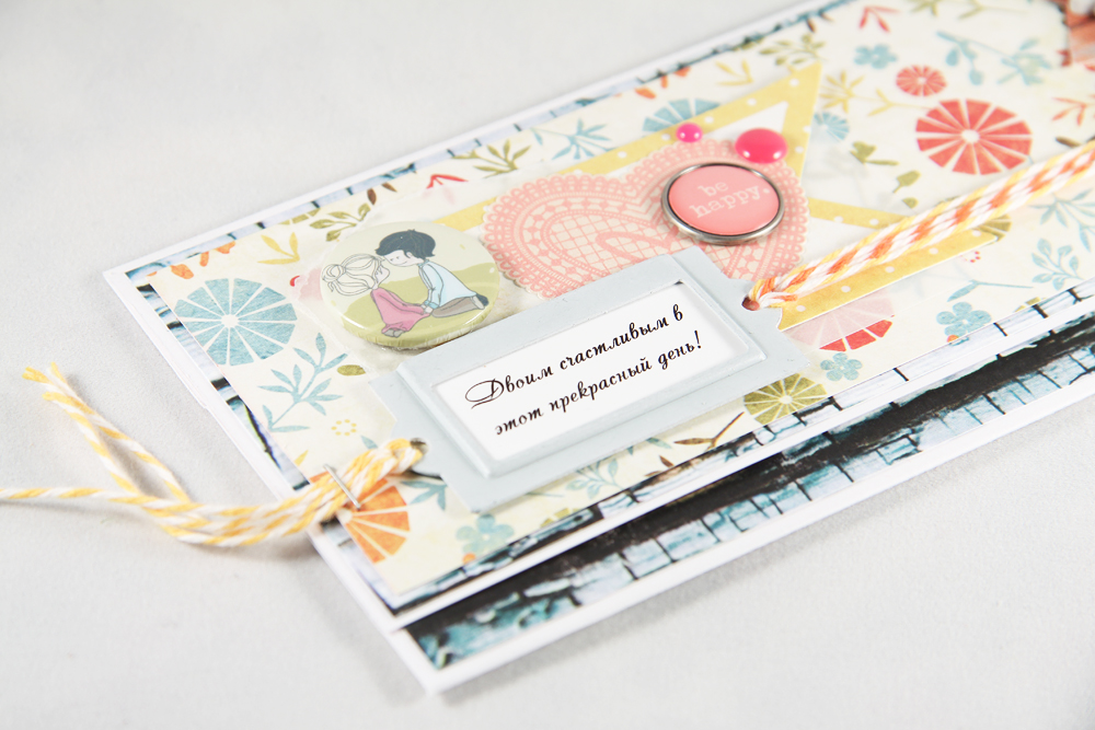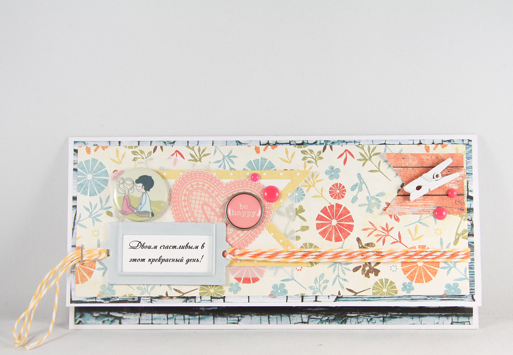 Когда кармашек склеен, связываем ленточки конверта и выстраиваем композицию.