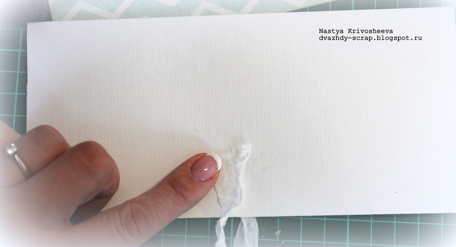 Далее клеим ленточки-завязки. Отмеряем и нарезаем 2 кусочка лент 24-25см. Я предпочитаю мятые шебби-ленты. Клеим один кусочек на середину (9,5см от бокового края) "спинки" конверта и на середину ВЕРХНЕГО (закрывающего) клапана.