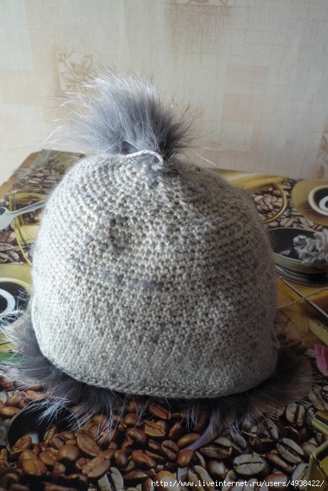 Где-то через 8 см я начала убавления, сначала делала убавления по 5 столбиков в рядке, где не было меха, а рядок с мехом вязала без убавлений. Подойдя к макушке перешла на убавления - 6 столбиков без накида в каждом рядке, так же чередуя рядок с мехом и рядок без меха, До конца закрыть отверстие у меня не получилось, но снаружи его не видно, мех прикрывает.