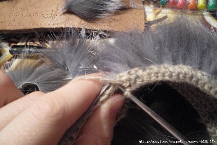 Меховые полосочки я сшивала по ходу вязания, чтобы меховая нить не была длиной. При этом важно соблюдать направление меха (мех вниз), сшивала простой ниткой с иголкой.