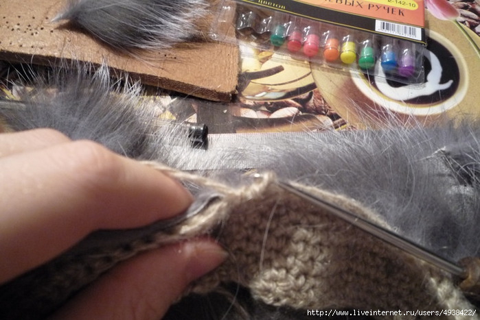 2 ряд начинаем "привязывать" мех, мездрой прикладываем к вязанию и вяжем столбик без накида, при этом вводим крючок в петлю и сзади между меха около мездры, захватываем нитку и провязываем обычный столбик без накида, далее вяжем столбик без накида без меха, и так чередуем столбик с мехом и 1 или 2 без меха.