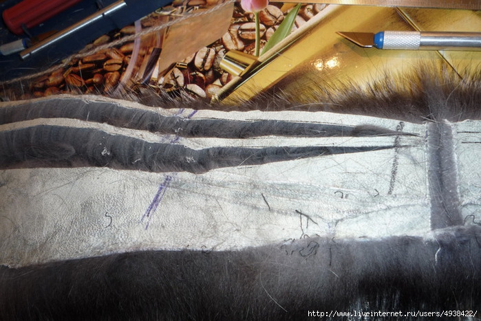 Мех расчертить на полосочки около 0,5 см, нарезать его. (я резала ножом для работы с деревом, он очень тонкий и ОЧЕНЬ острый,можно резать канцелярским ножом. Отсортировать по качеству. Так как у меня был сшитый воротник, то в нем попадались различного качества мех, тот что получше в одну кучку, остальное в другую (пригодится).