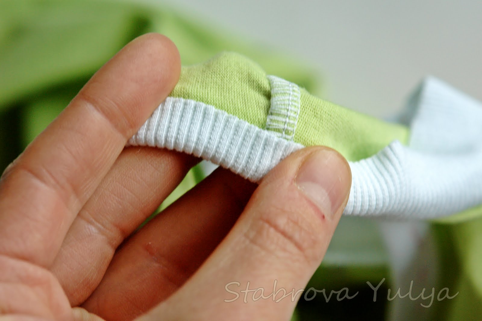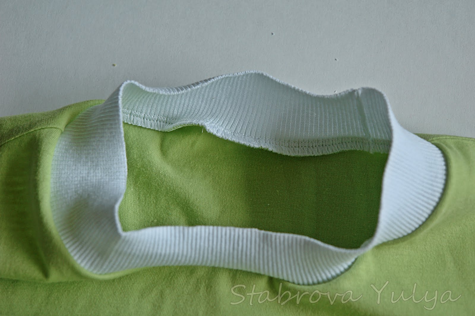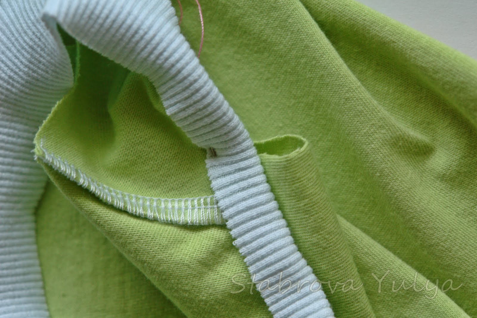 Итак, на примере майки обработаем горловину. Материалы-кулирка х/б и кашкорсе с лайкрой.