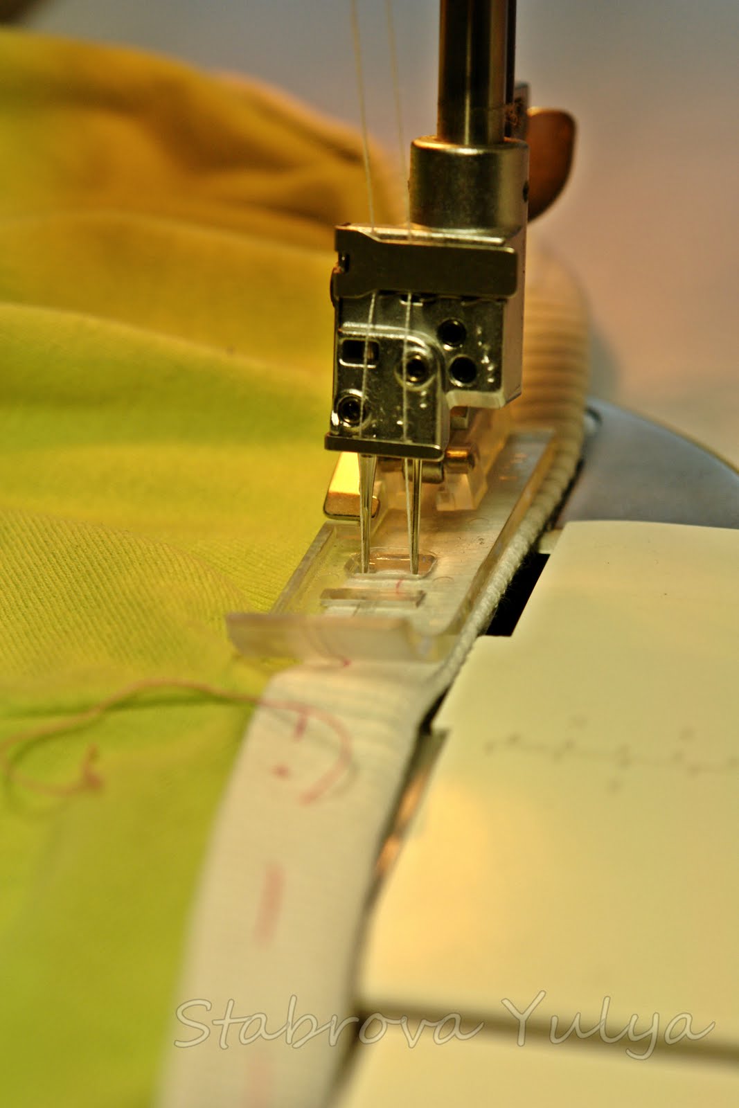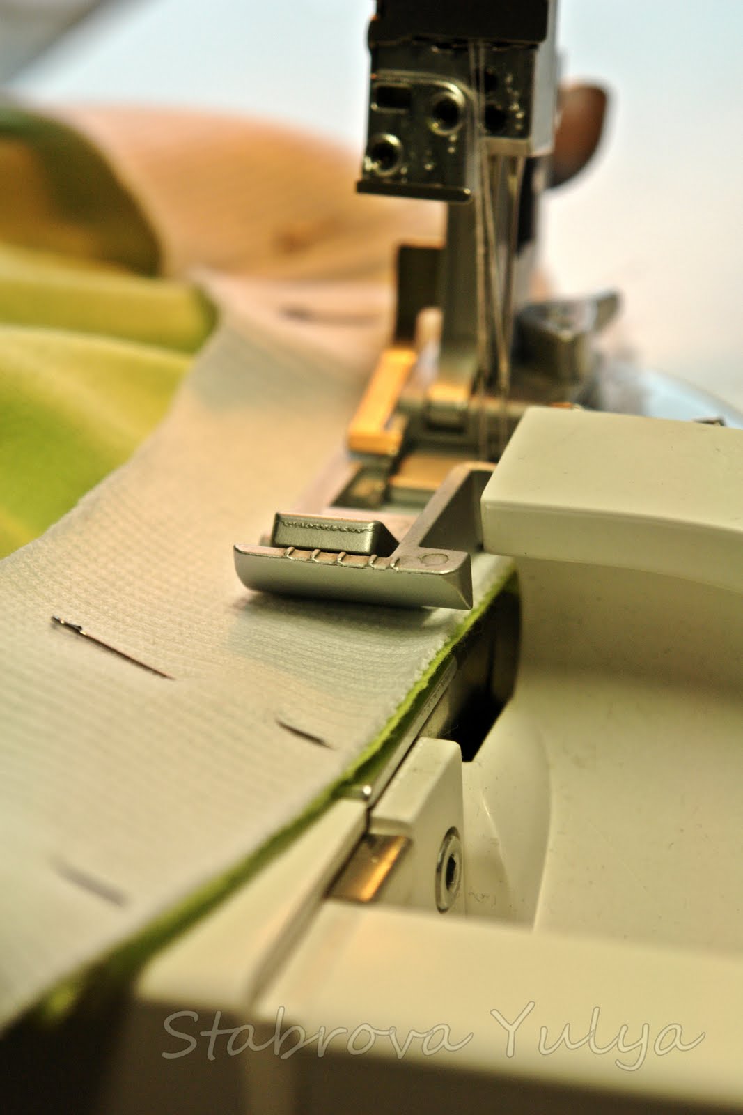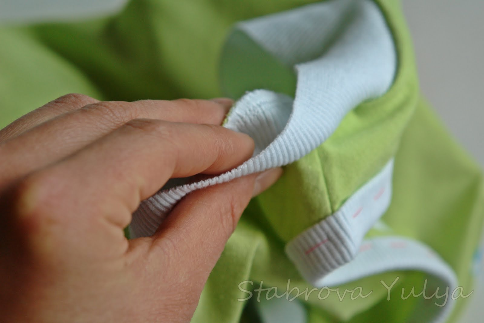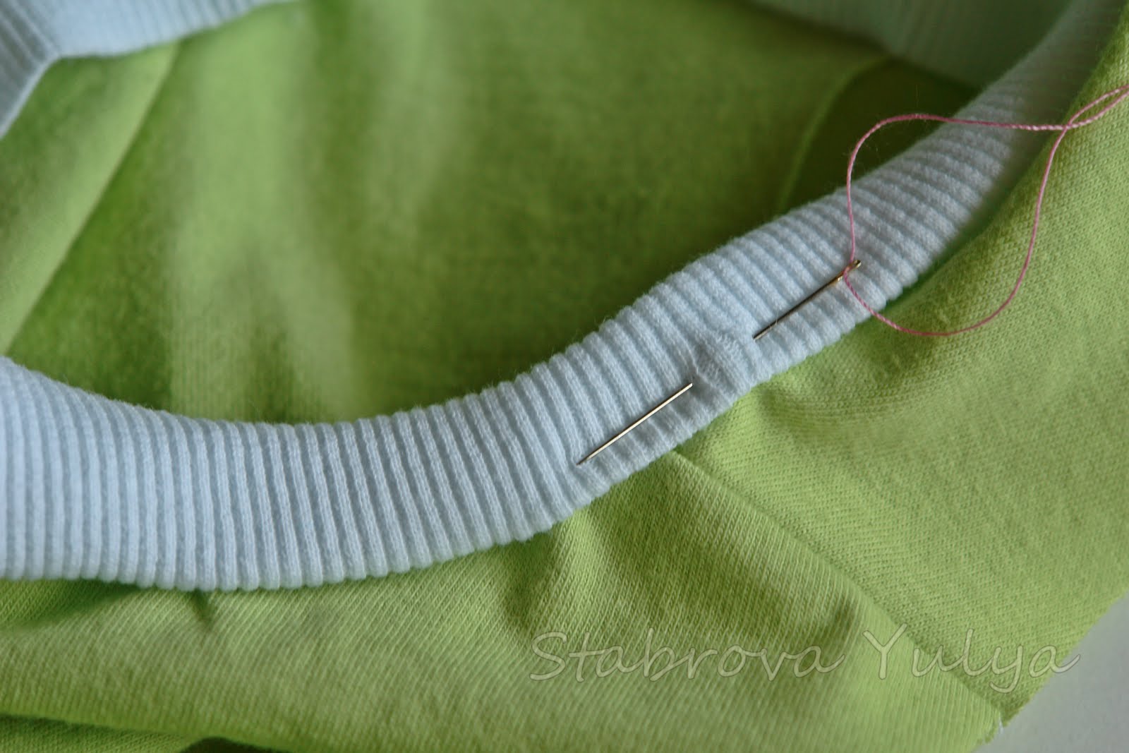 8 .Отстрачиваем горловину распошивальным швом. Заправляем нитки стыка строчки. Приутюживаем.