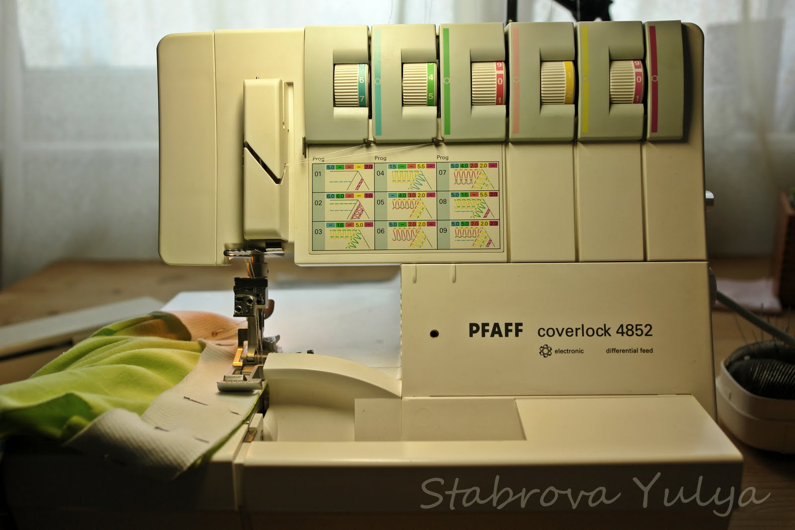 1. Выкраиваем обтачку. Оговорюсь. В моём коверлоке только один вид распошивального шва. Он широкий (0,5см). Поэтому оптимально для этого вида окантовки взять обтачку 4см по ширине. Длина должна быть 2/3 от окружности горловины.