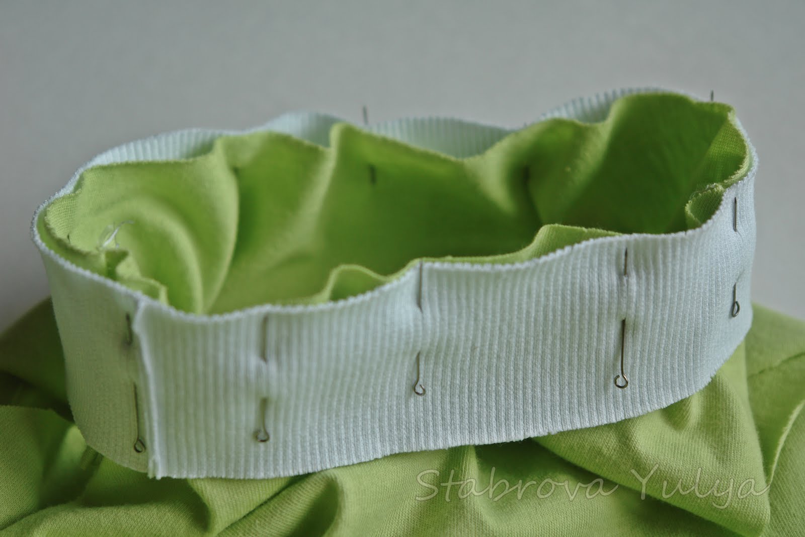 3. Распределяем обтачку по горловине,закалываем булавками.
