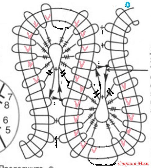 Синий круг - начало вязания, красные галочки - укороченные ряды (2 ст. с\н, 1 полуст. с\н, 1ст. б\н), в круге 12 ст., первый и последний с 2-мя накидами, 10 ст. с 3-мя н., между ними 1 в. п. Тесьма состоит из 4 ст. и 5 в. п. арочки