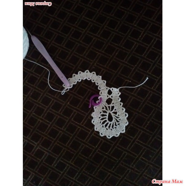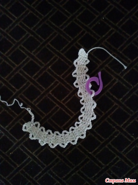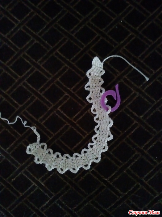 Изгиб тесьмы, поворот тесьмы можно получить, если провязать вместе одним столбиком несколько дужек тесьмы. На схемах место изгиба обозначают изогнутой стрелкой, объединяющей дужки. Иногда на схемах такая стрелка отсутствует, а о необходимости выполнения такого соединения говорит изгиб тесьмы на схеме и сближение внутри него дужек. ![]()