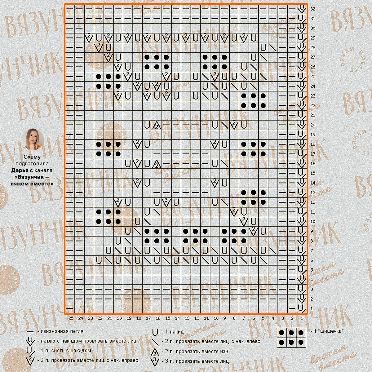 Здесь есть обозначение «шишечка». Чтобы его выполнить, 1 секцию (3 точки) вяжите 3 петли лицевыми туда-обратно столько раз, сколько надо для формирования шишечки, 2 секция (3 точки) в следующем ряду провязываем петли лицевыми