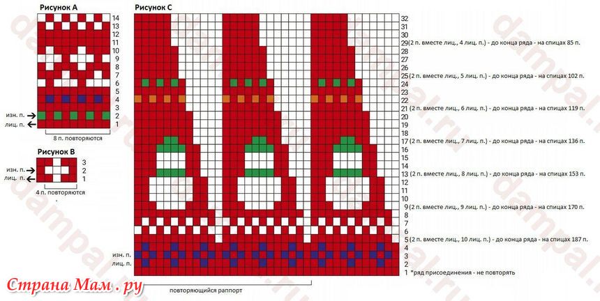 Связать 32 ряда рисунка С (1-й ряд рисунка уже провязан), выполняя убавления в указанных местах.