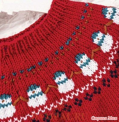 Детский джемпер создает новогоднее настроение благодаря рисункам снеговиков на кокетке.